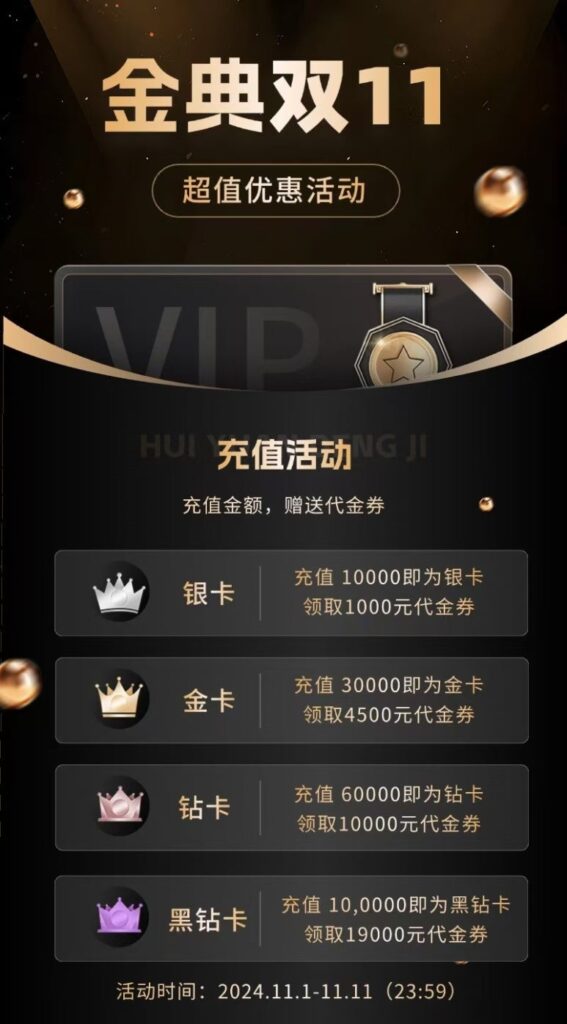 1만위안 충전하면 1천위안을 추가로 부여해서 총 1만1천위안을 쓸수 있도록해주겠다는 내용입니다. 3만,6만 10만위안. 10만위안이면 2천만원이죠.