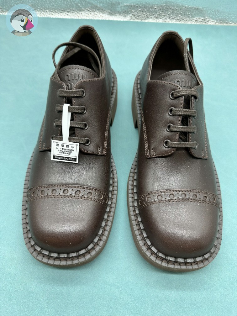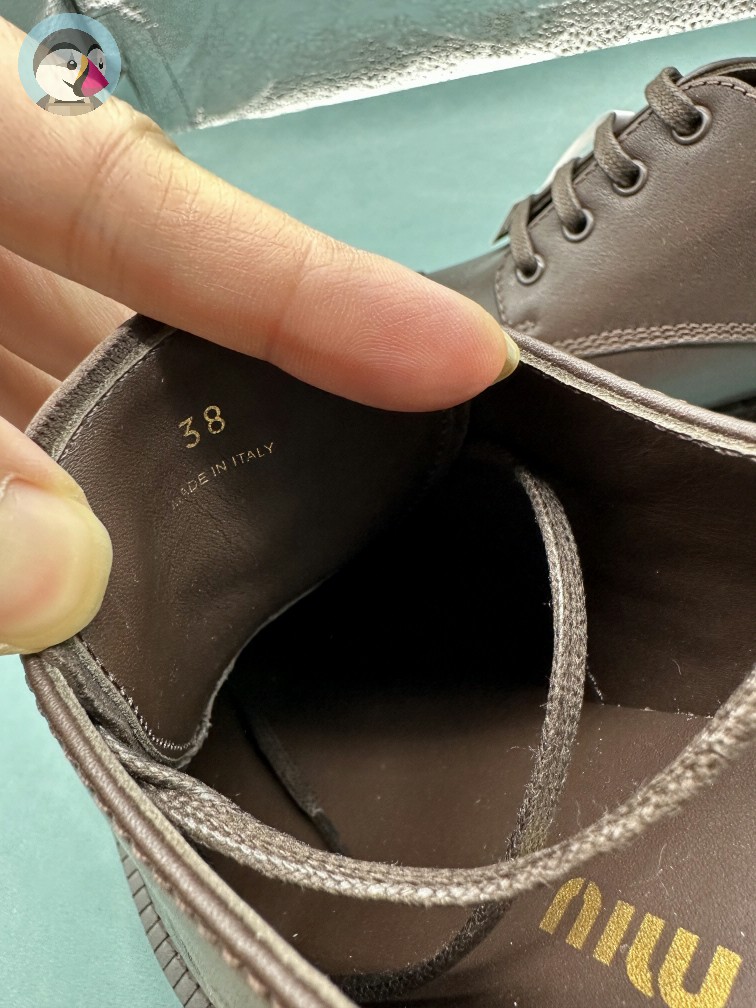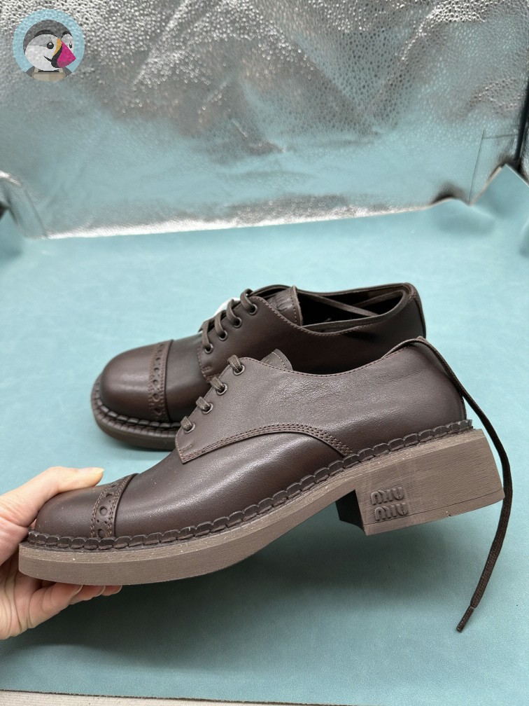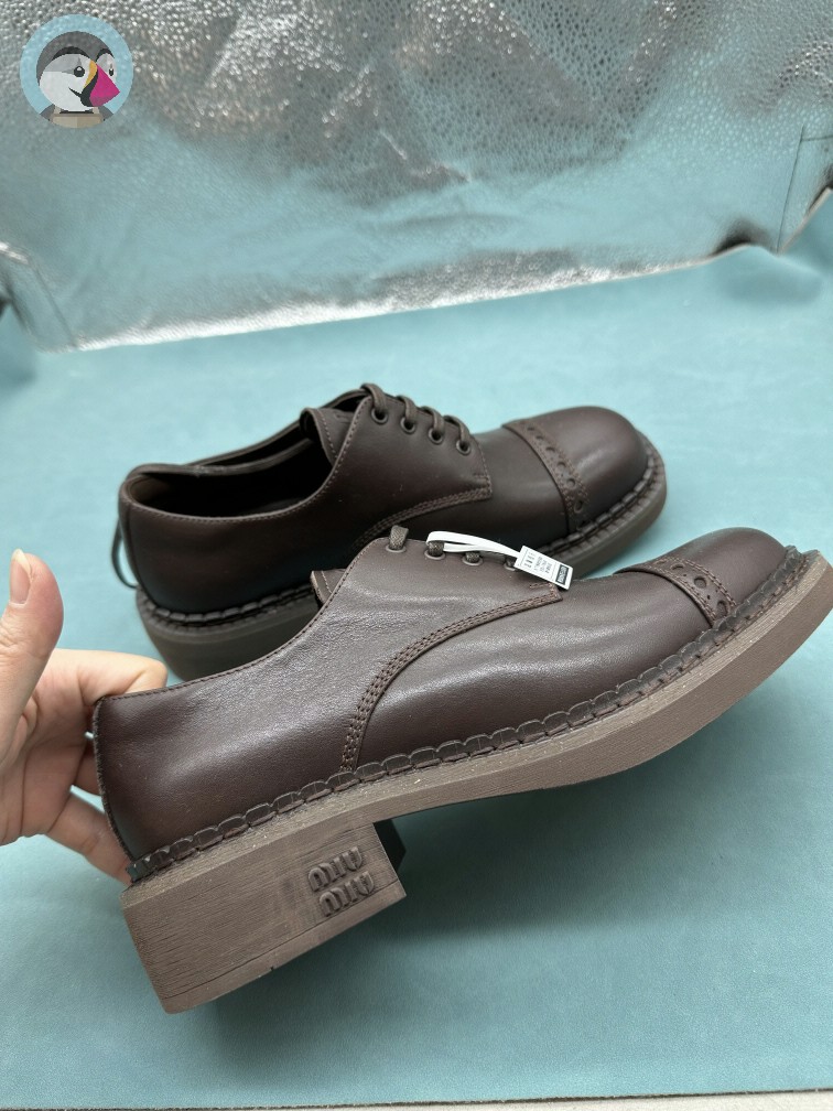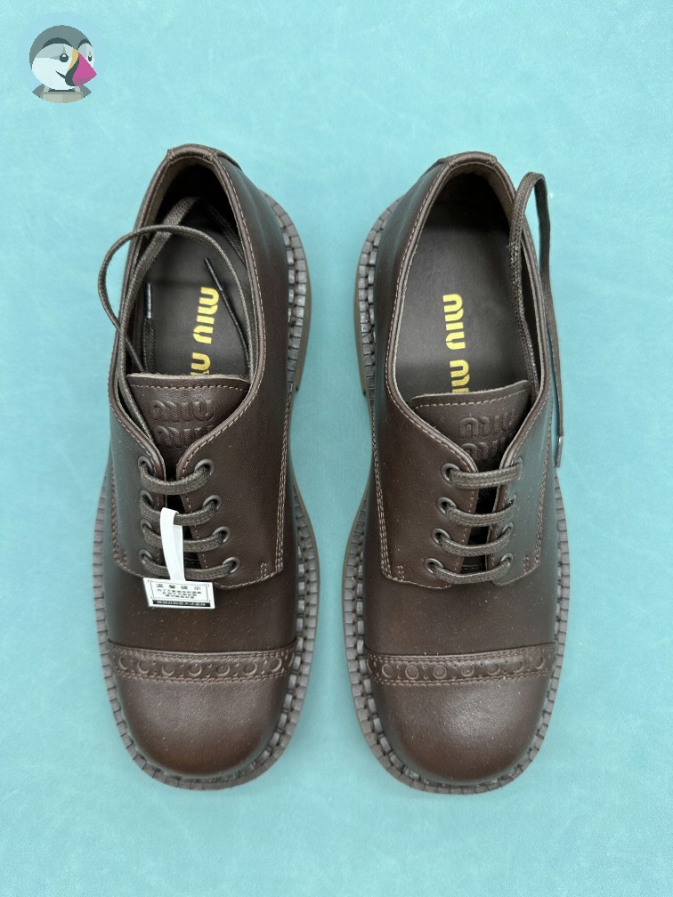 - 디자인: 날렵한 앞코, 레이스업 클로징, 미우미우 로고 디테일이 어우러져 포멀함과 개성을 동시에 갖춘 디자인.