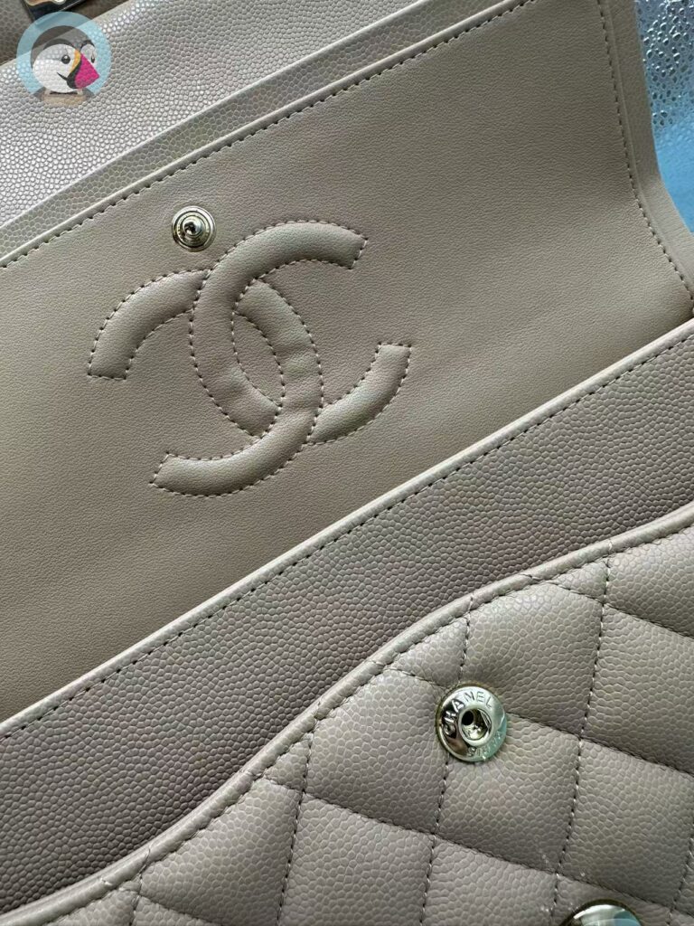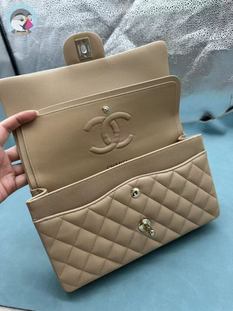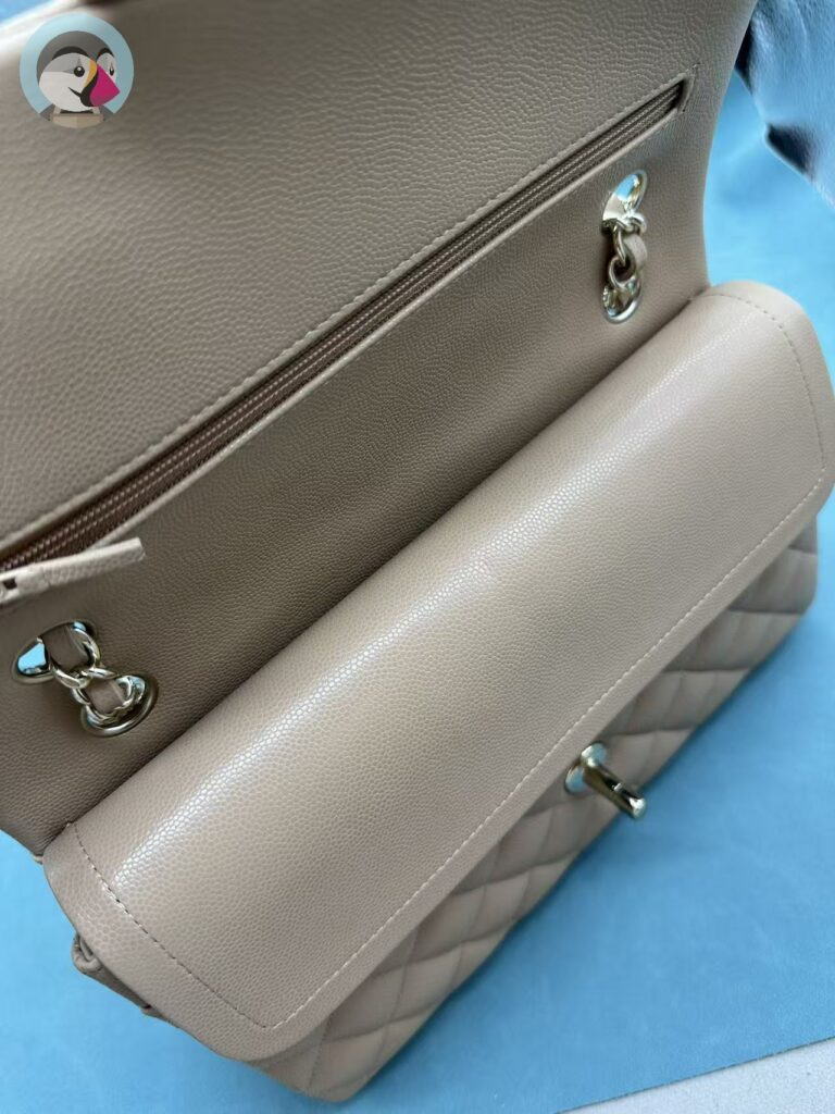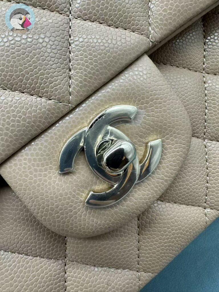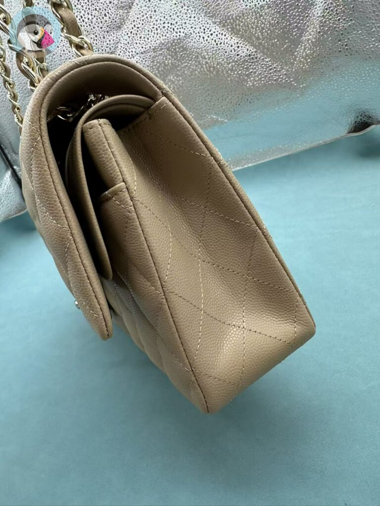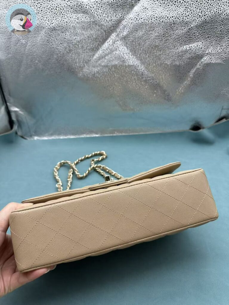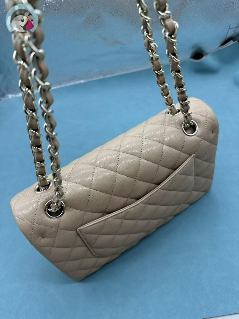 샤넬 캐비어 클래식 미듐 플랩백 베이지 — 샤넬의 아이코닉한 디자인과 고급스러운 캐비어 가죽이 만나 완성된 명품백의 정석